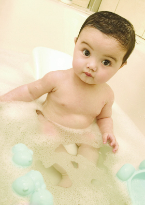 4、对稍大些的宝宝,浴盆中的水可以深10~13厘米。而新生婴儿在浴盆中,水深5~8厘米为宜。